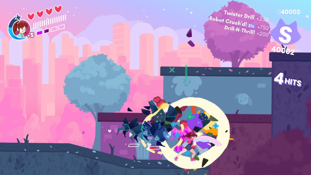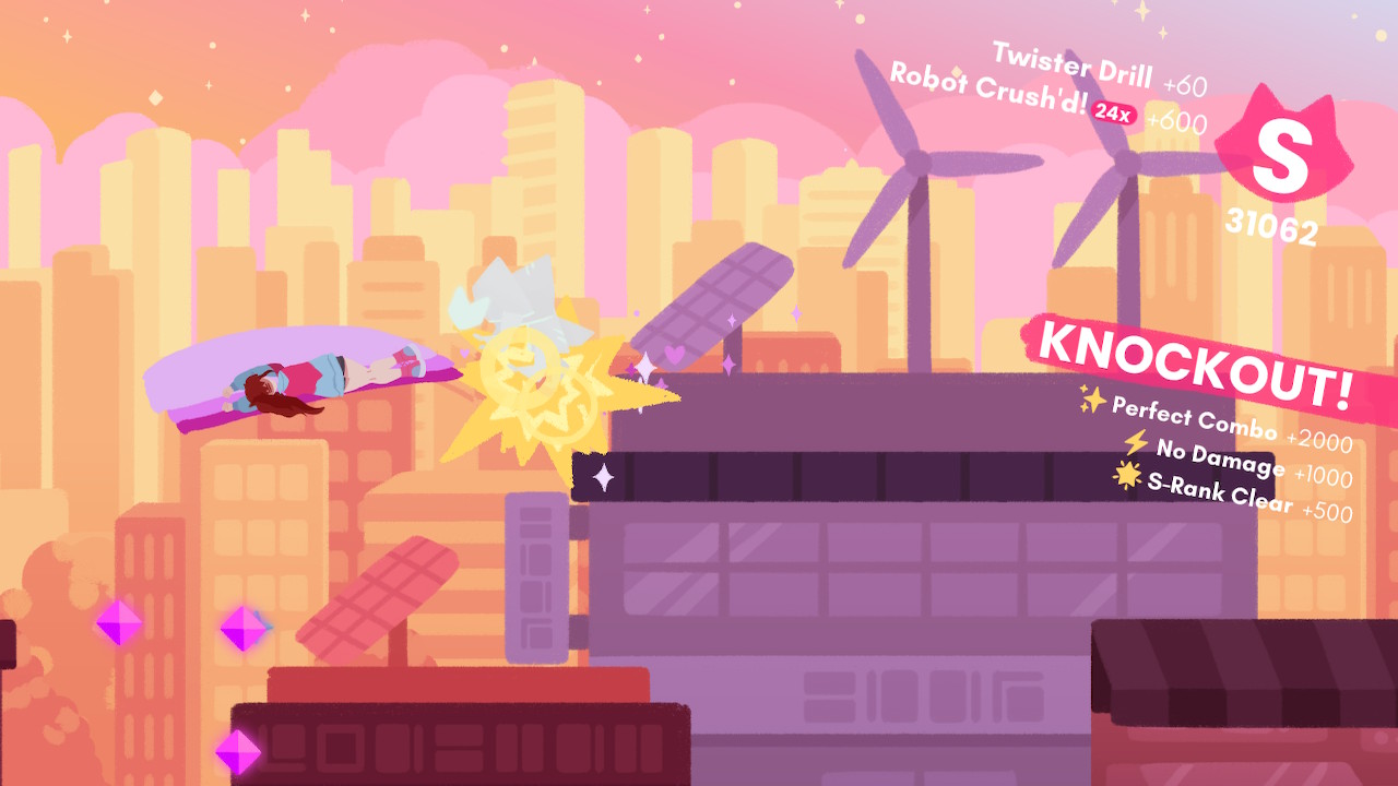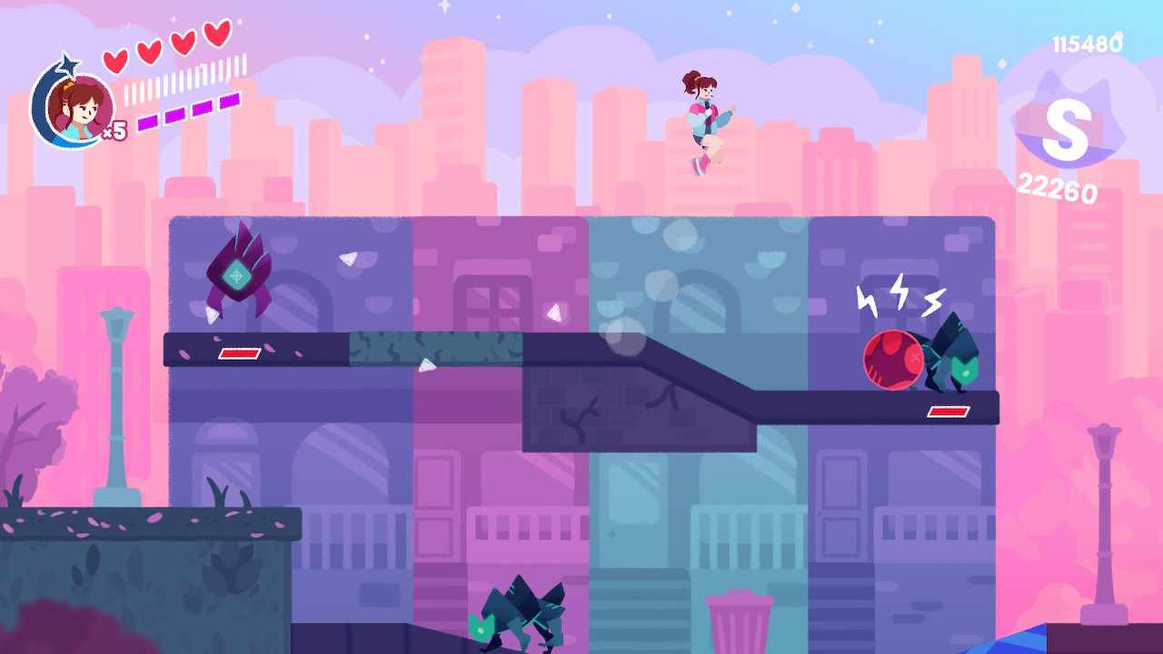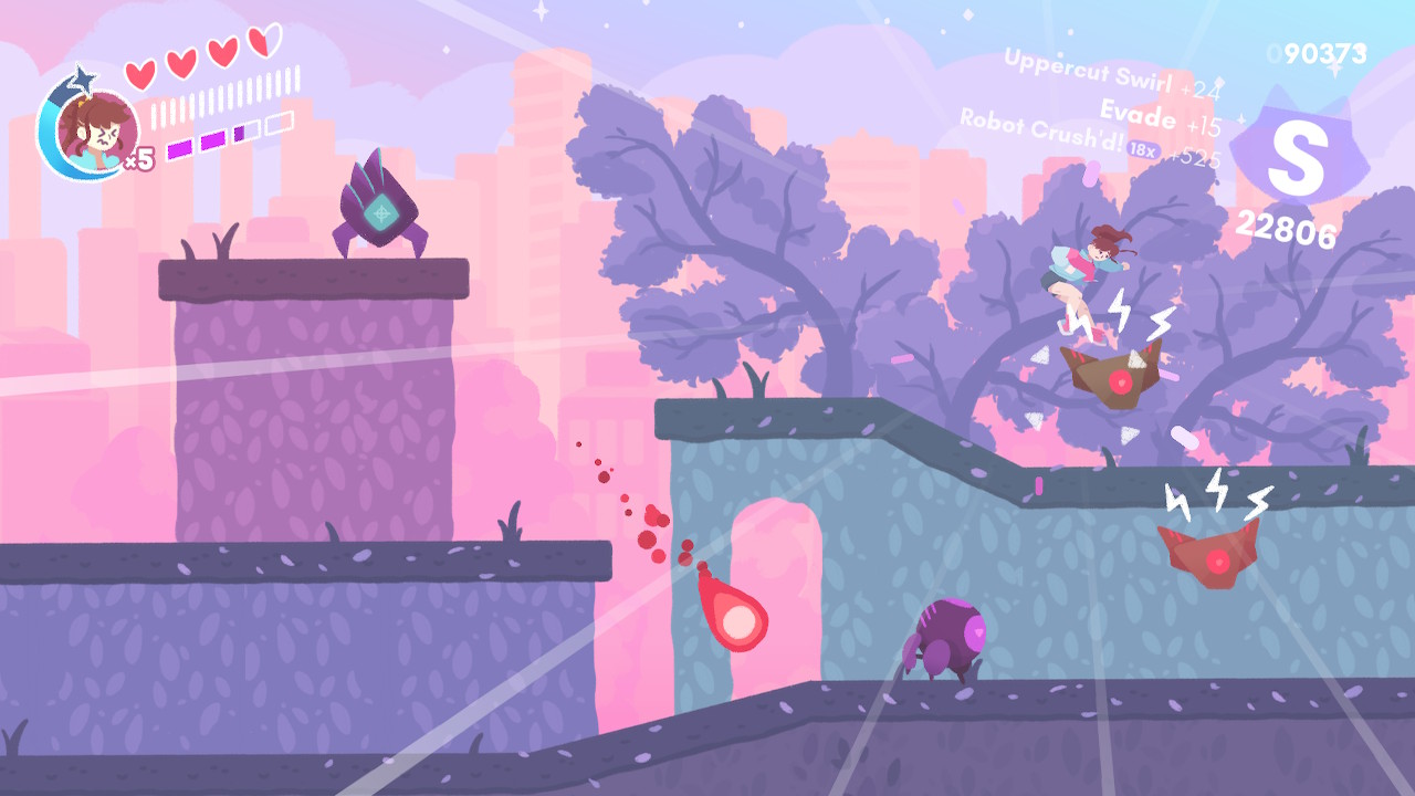 Beat-em-ups are a genre that’s been around a long time, but like many old genres, it’s undergone its share of divergent evolution. Games such as Streets of Rage 4 stick to the old formula with slight tweaks, while games like The Wonderful 101 change the gameplay mechanics in major ways while keeping the same basic concept of “repeatedly hit enemies that swarm you in big groups until they’re gone, then move on and do it again.” Super Crush K.O. takes the beat-em-up concept and turns it in a different direction: into a 2D platformer with a big emphasis on jumping and racking up combos for points.