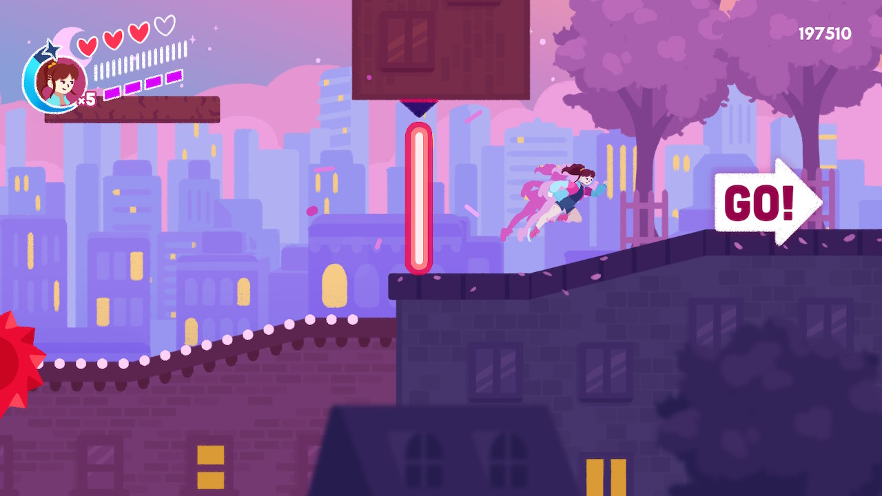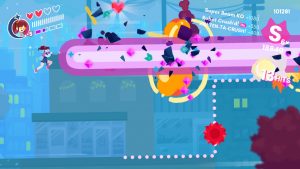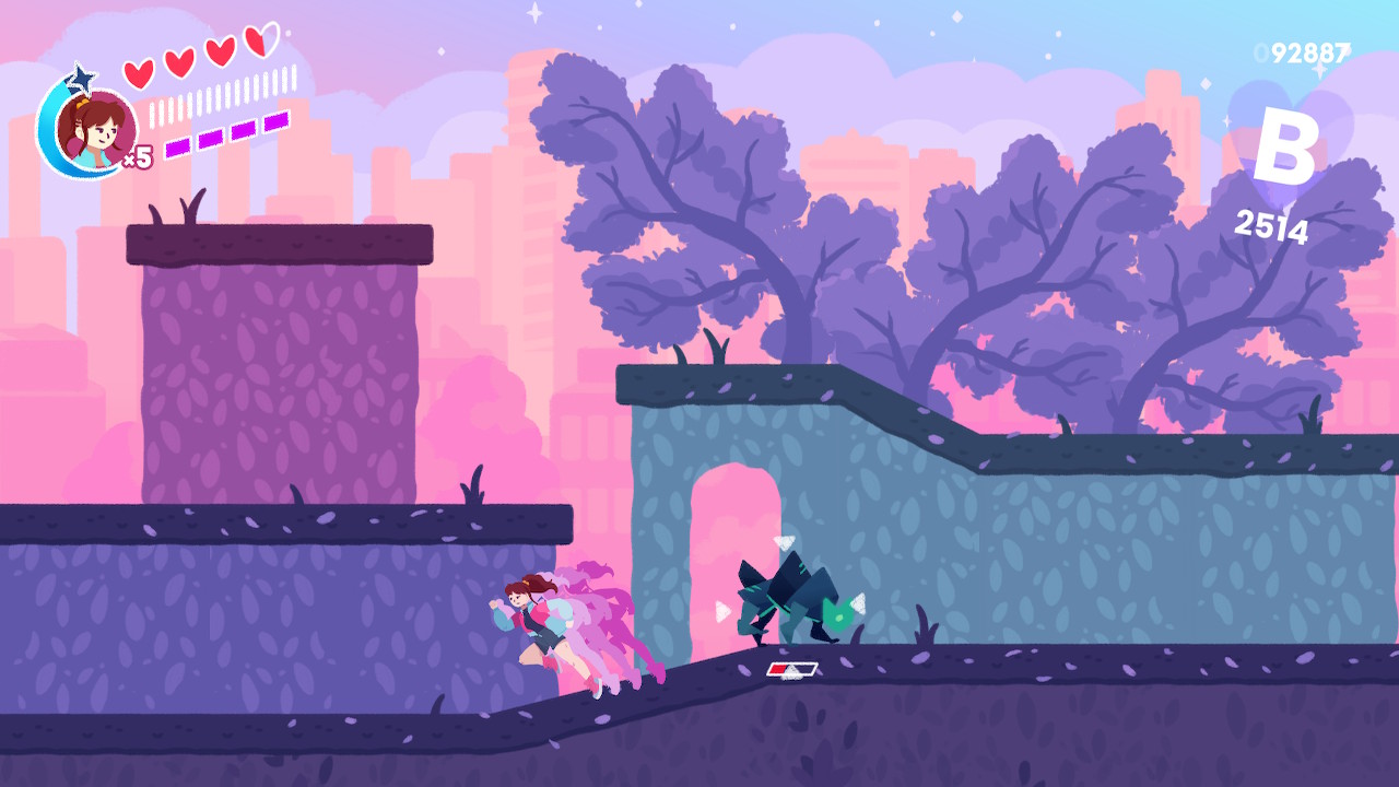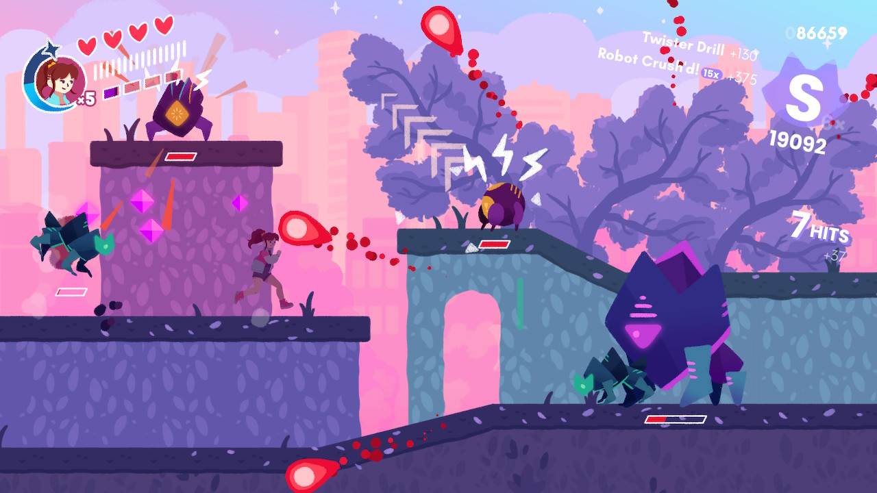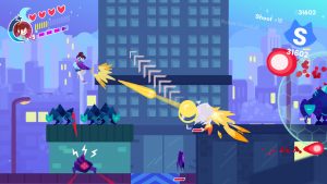 Beat-em-ups are a genre that’s been around a long time, but like many old genres, it’s undergone its share of divergent evolution. Games such as Streets of Rage 4 stick to the old formula with slight tweaks, while games like The Wonderful 101 change the gameplay mechanics in major ways while keeping the same basic concept of “repeatedly hit enemies that swarm you in big groups until they’re gone, then move on and do it again.” Super Crush K.O. takes the beat-em-up concept and turns it in a different direction: into a 2D platformer with a big emphasis on jumping and racking up combos for points.