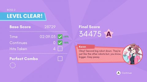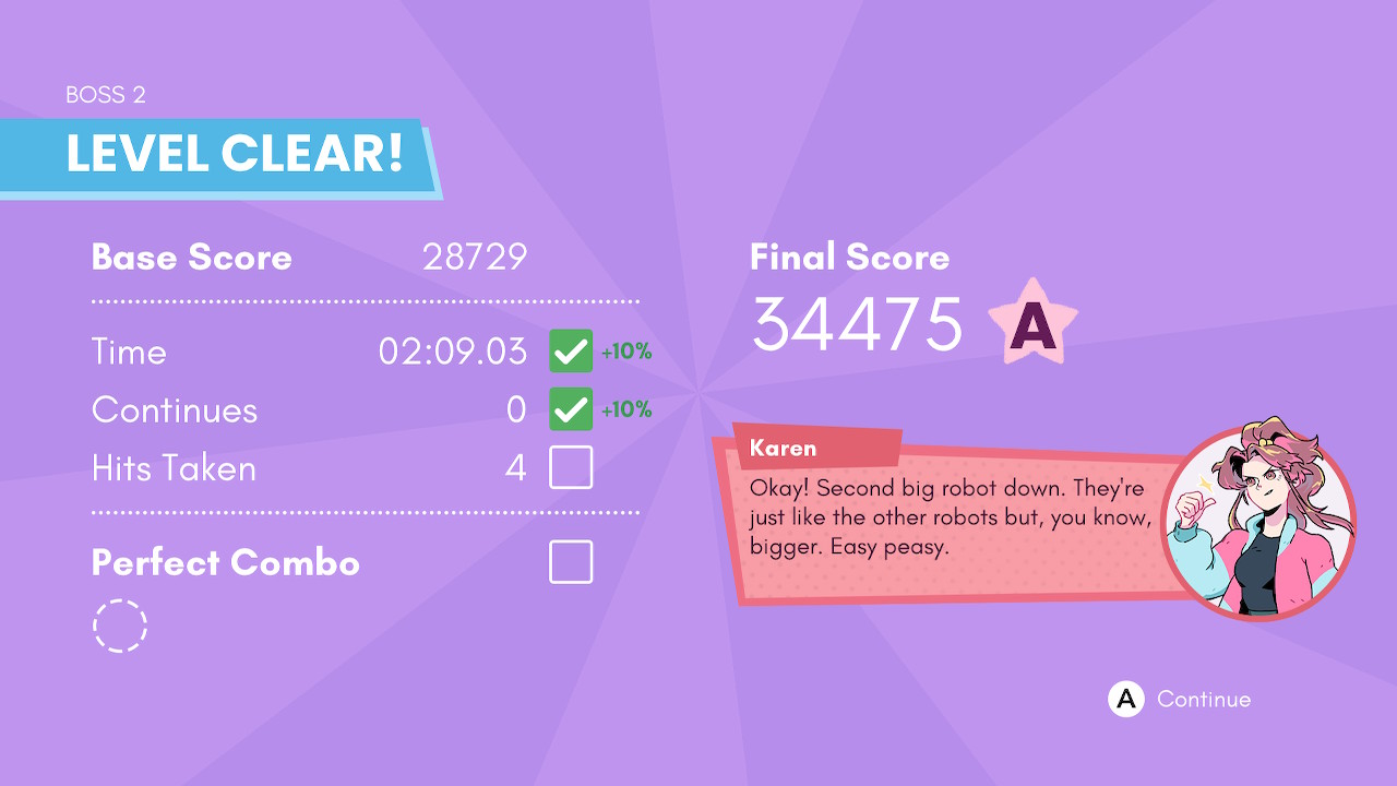 At the end of the level, you receive points bonuses for things like not getting hit once, beating the level quickly, and never dying once. There’s also a “perfect combo,” which means a totally uninterrupted combo that never stops either due to getting hit or the combo timer running out.