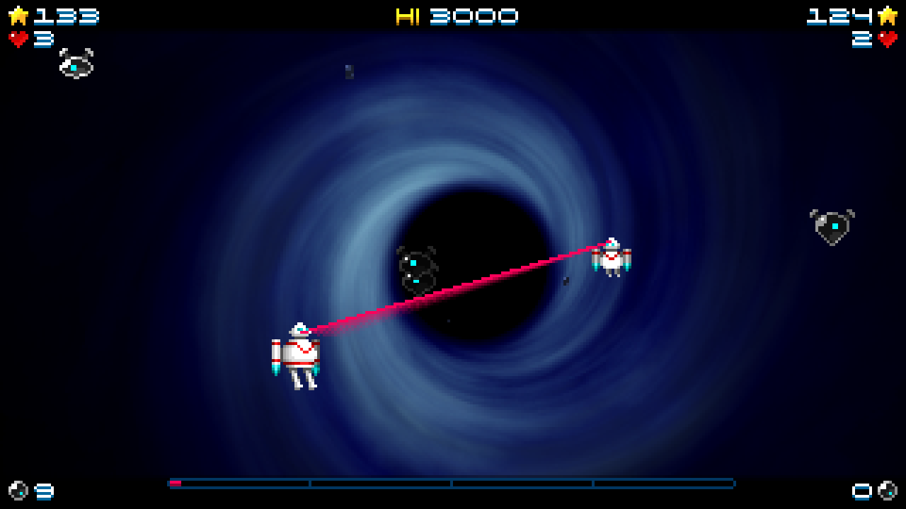 In addition to the extra levels and weapons, Super Hydorah has a few other small fixes too, including two-player simultaneous play, and a separate minigame starring the robot father-and-son found in the main game. It also has better compatibility for newer computers, and a display option to mimic CRT televisions, in addition to various interface tweaks, like an easier-to-read status bar, and some slightly tuned up graphics and sound. It also supports both digital and analog control, for more precise maneuvering.