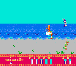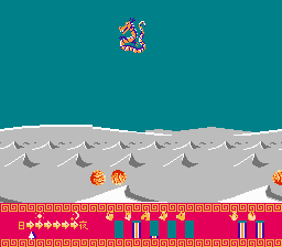 Every once in awhile, the game will appear to glitch up, and all of a sudden you’ll find yourself in the middle of a sidescrolling action sequence. These are impenetrably designed and programmed, as sprites move around the screen in ways that are only comprehensible by madmen and game rules like “hit detection” cease to have meaning. Son Goku is the primary warrior, if only because he seems to have the most health, but upon getting killed, the other party members – the king and his horse in the early stages of the game, and later a pig and a kappa – will resume in his stead. But not only are both of the other initial characters utterly useless, but the developers neglected to create a unique sprite for the horse, so it just takes on the form of one of the enemies – particularly, the dragon. Apparently it is a transforming horse – which actually is less ludicrious than it sounds, considering that it’s faithful to the original story.
