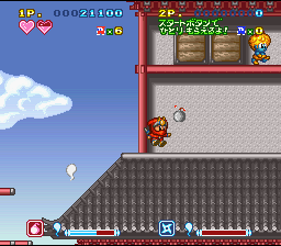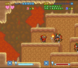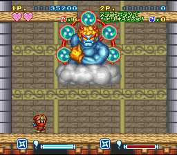 An update of the original arcade games, Super Ninja-kun features improved 16-bit graphics, a much larger variety of stages, boss battles, dashing abilities, and a two-player mode. Ninja-kun can now take several hits before he dies, and can even expand his life meter by grabbing heart containers found throughout the stages. The hero once again begins with the standard shuriken, but after beating a level, he is rewarded with new weapons, including bombs, lightning bolts, and more. When collecting spirits from fallen enemies, it charges a power gauge, allowing to unleash a variety of magic spells.