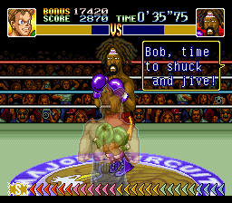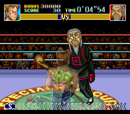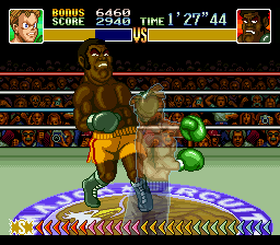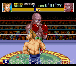 The dodging system has been revamped as well, making this version the easiest to defend oneself. In the other games, you had to press the direction you wanted to block an attack with (Up blocking upwards, Down blocking downwards). In Mike Tyson’s Punch-Out!!, you could only block upwards, anyway. Here, pressing up blocks upwards – however not pressing anything allows you block body blows automatically. It really makes the game that much easier, and gives more control about the character instead of being thrown off due to not pressing the correct directional button. You can also dodge left and right as well as duck.