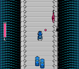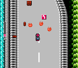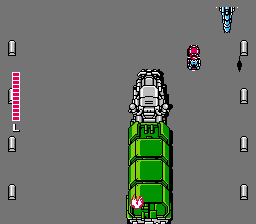 As with any shoot-em-up, power-ups are your friends. In Super Spy Hunter, they come in the form of red and blue vehicles. Both types of vehicles will cycle through different letters. Once the vehicle is destroyed, it will throw out the letter icon last displayed. Powerups from red vehicles mostly provide mods for your primary cannons, such as automatic directional control instead of manual, extra power, rapid shooting, and extra life for your measly life bar. Blue vehicles provide 1-Ups and secondary weapons, like screen-clearing bombs, oil slicks, tire slashers that remove cars from either side of you, and a detachable cannon attack. Once you’ve used the blue attack, they disappear until you destroy another blue vehicle, but your red attacks stay with you until you die.