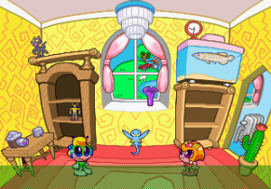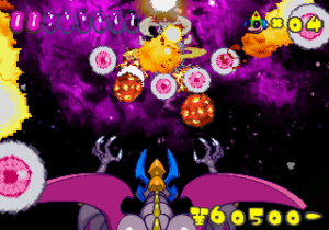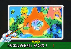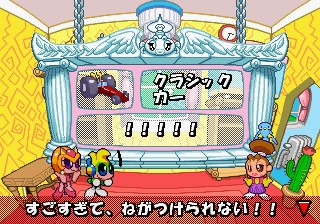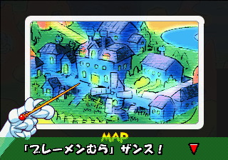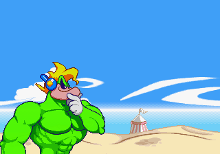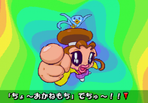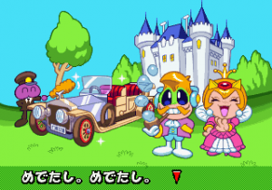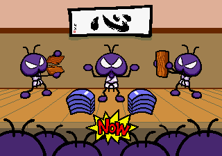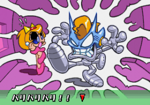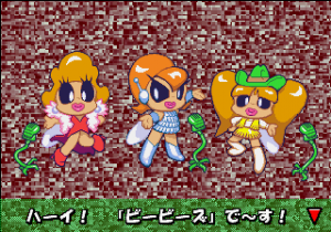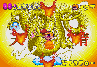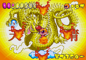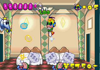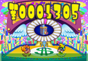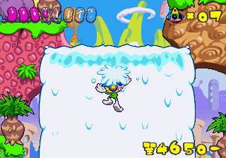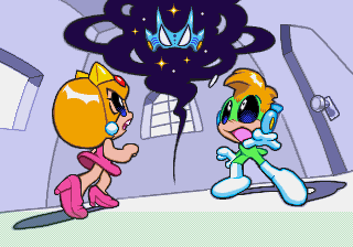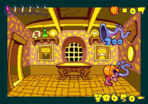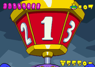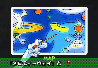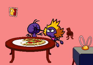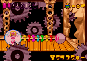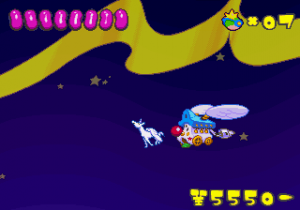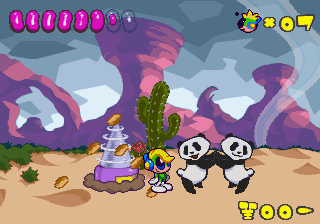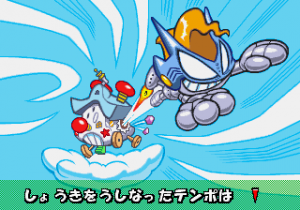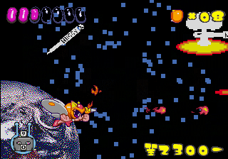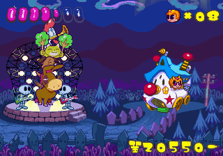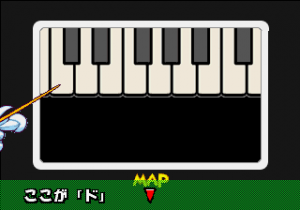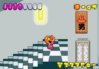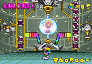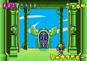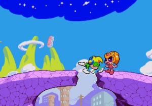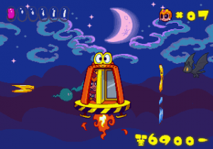 Which is precisely why the game’s humorous tone works as well as it does: it allows the game to have a consistent image in the first place, something neither of its predecessors can claim. Tempo had trouble conveying a proper mood in the gameplay, and while Tempo Jr. didn’t suffer that problem, the game could only avoid it through negation. Super Tempo succumbs to neither of these problems. By switching so rapidly from gag to gag to gag, the player knows exactly what they’re going to get. What’s more, they’re more likely to enjoy it. Putting aside the non-sequitur side of the game, what makes Super Tempo work is how involved the world is. All those gags bring the game world to life. Each one reaches out to you, asking you to interact with it or laugh or just get yourself involved with what the game’s presenting you. Even the power-ups get in on the fun: they’re more interested in making you laugh than they are in actually powering you up.