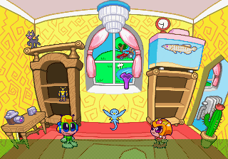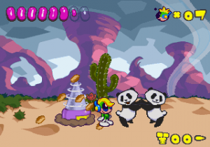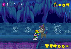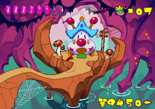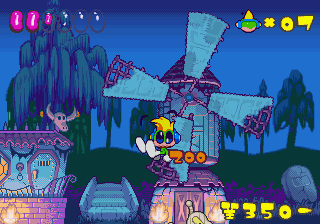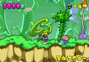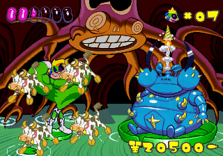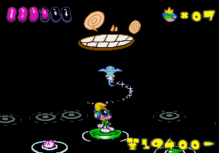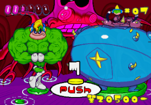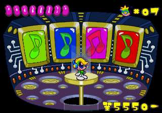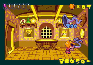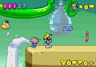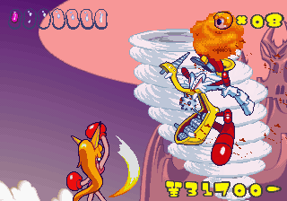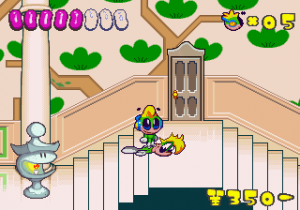 Just as Tempo Jr. drew strength from its calm tone, so does Super Tempo‘s outlandish zaniness prove to be its greatest aspect. It lends the game a delightful sense of humor that just wasn’t as present in either of the previous games. Now that doesn’t mean either of those games lacked a sense of humor; just that the humor in this game is definitely more palpable. The backdrops prove that well enough, as all the peculiar curves and shapes that go into making them lend a playful quality to the levels. Likewise, the character designs are so bouncy and rubbery (even more so than they were in Tempo) that just watching the characters animate is enjoyable on its own. This comical tone isn’t just limited to the visuals, though. It permeates every part of the game’s design, from the peppy soundtrack to the gags scattered across the levels (including a sly reference to Bonk).