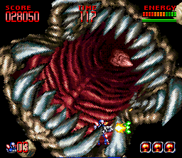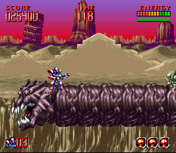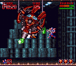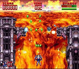 Even more than Mega Turrican, the game is packed with sensational events and set-pieces, from a worm-riding stage (blessed with the best music in the game), to a spaceship so huge that it demands much use of the bionic arm (now even more reminiscent of Bionic Commando), to just about every single boss battle in the game. Never before have bosses been that spectacular in a Turrican game. They are all very challenging as well.