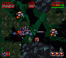 Here we are at Turrican’s Long Goodbye. Factor 5 are such a talented team, this game could be considered a proof they were the best non-Japanese developers on SNES at times. It is, however, a major departure from the original spirit of series. After many rehashes of graphics and elements, this game is build again from scratch. The Turrican Suit was completely redesigned with a much darker look. When idle, Turrican starts to fire his machine gun into the air. The arsenal involves again the three usual standard weapons; the pocket homing missile from Mega Turrican is back, and the smart bomb this time looks like a nuke blast. Finally, Factor 5 apparently couldn’t make up their mind whether they preferred the grappling hook or the freeze beam, so they put in both, and added a flamethrower for good measure.