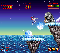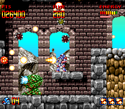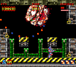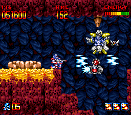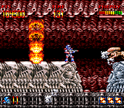 The beginning of the game is a melange of the first worlds of Turrican I and II, whereas the last stage is directly taken from Mega Turrican’s penultimate world, the Alien one. More borrowings from past episodes follow throughout the game; the only stages that are really new is a substage inside of a volcano and an ice world. They feel distant from Turrican’s usual atmosphere, and almost seem forced, as if every console platformer needed them. The ice stage at least redeems itself with a neat gimmick that involves riding on huge snowballs, yet its still the most linear and most boring stage in the game. Mega Turrican’s final factory world that ended with the confrontation against The Machine is simply missing, the game just ends after the Alien boss, despite showing The Machine in the intro and outro.