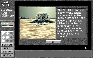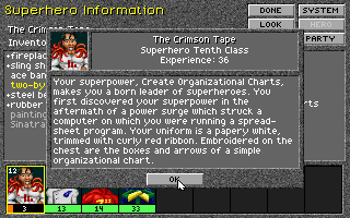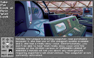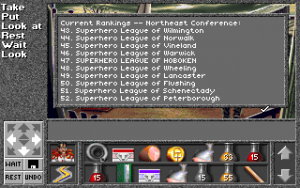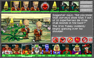 It turns out things are not all that bad, however. You could hardly expect them to be – unlike many contemporary Legend properties, this is a game with an original story by the great Steve Meretzky, the industry veteran responsible not only for many of Legend’s hilarious adventure games, including the Spellcasting series, but also for many of the classic Infocom text adventures that preceded them. Thus, the remnants of civilization are not overcome by despair, for they find protection in the form of the Superhero Leagues, including the titular Superhero League of Hoboken.
