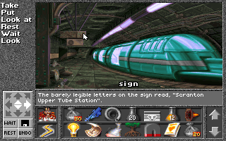 Apart from towns are the many other locations you’ll visit over the course of your missions, most of which only take up a screen or two. Many of them are based on actual landmarks ravaged by the fall of civilization – Dodger Stadium, the Empire State Building, the Statue of Liberty, and so on. There are plenty of parts of suburban New Jersey too, including Paterson, East Orange, Morristown and Hackensack, as well as parts of New York (Poughkeepsie) and Pennsylvania (Scranton). These locations are presented through an interface that looks exactly like Legend’s other adventure games, with the usual first-person point of view and serviceable VGA graphics with largely nonexistent animation. There’s a good number of NPCs to talk to, and the CD-ROM version provides fully voiced dialog.
