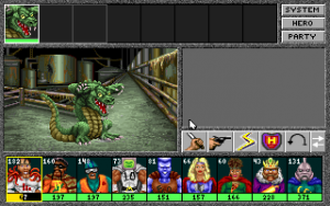 One of the first things you’ll do in the headquarters is assemble a team of superheroes from among those gathered in the cafeteria. You’ll never actually see anything more of them than what you can see in their portraits, and with one possible exception, none of them undergo any kind of character development. Still, they each have their own little paragraph of background information and two unique dialog blurbs should you choose to talk to them. If nothing else, they’re a fairly original bunch and you cannot easily call any of them a knockoff of something from DC or Marvel.