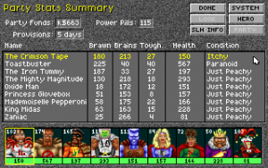 Like pretty much any RPG, you’ll encounter towns equipped with the usual shops, as well as the aforementioned hostelries. Somewhat atypical are the brothels, which basically serve as an amusing way of trading money for experience points. There’s occasionally some mission-related adventuring business required at any given town, and pawn shops also often hoard vital items. Every single item is unique, so you’ll never have more than one of any particular item. The game consequently has some really inventive names for weapons and armor – you can outfit a character with an iron thimble, gore-tex hot pants, a vomitproof vest, and a concrete mortarboard, while having him fend enemies off with arsenic-tipped deer antlers and a bowel disruptor. In fact, every character can equip two weapons and a whopping ten pieces of armor (each for a different body part), without any other restrictions.