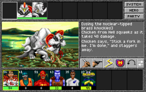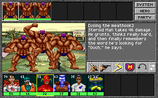 Some of your party members might be able to use their superpowers in combat. These powers, like projectile weapons, target individual enemies, and basically amount to magic spells – they’re extremely effective against some enemies, and completely useless against others. It’s usually pretty obvious which powers will affect a particular enemy, even though the powers take much more interesting forms than the usual fire/ice/lightning elemental stuff so common in RPGs. Tropical Oil Man, for example, can “Raise Foe’s Cholesterol”, effective against humanoids (and animals, to some extent). Conversely, Captain Excitement can “Put Animals To Sleep”, an effective power against animals (and not so much humanoids).