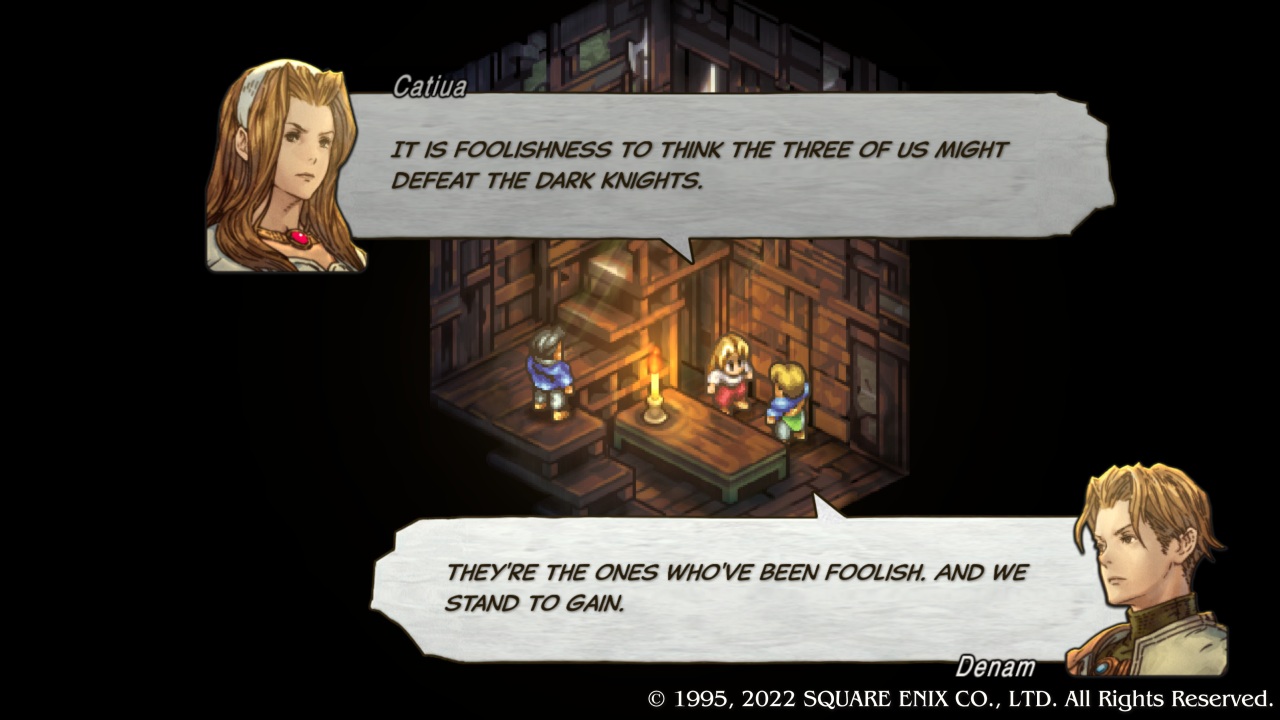 In the original game, despite the compelling plot, many moments of dramatic tension fall flat, and concepts are occasionally cloudy – due to the poor localization of the script for the PS1 port (whose text was dumped into a popular SFC fan “translation”). However, here Alexander O. Smith and Joseph Reeder handle the translation duties, and their work allows the story to speak to the player. Yes, ideas and dialogue are rendered in formal vernacular, true to the medieval setting – yet it is carried smoothly. It’s similar to the dialogue in Wolf Hall by Hilary Mantel, a novel about political intrigue and backstabbing in 1530s England. It’s all in the delivery.