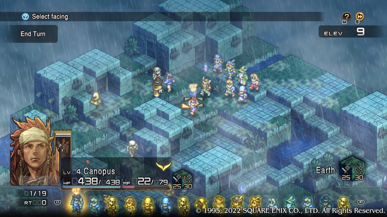 This is entwined with the statistical properties of units. Elevation especially matters, as units can only move “up” by as many squares as their “Jump” stat dictates. Moreover, having the higher ground in melee and ranged assaults will boost accuracy. For archers, attacks from high elevation are even made stronger, to simulate gravity’s effect, making them an infamously powerful class.