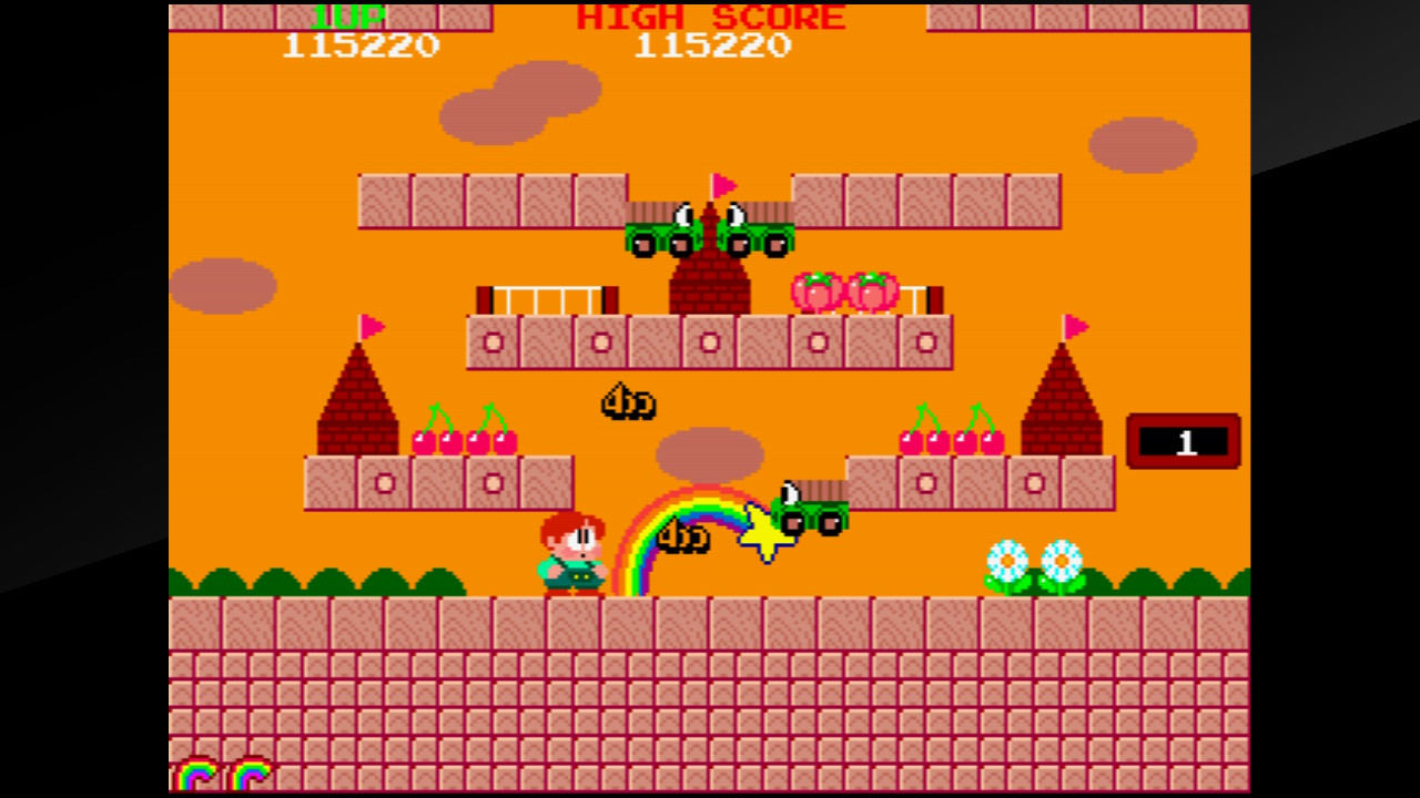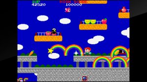 This follow-up to Bubble Bobble features the same dinosaurs but now in human form, as they scale vertically-scrolling stages and destroy enemies using rainbows. Like its predecessor, it’s also filled with obscure scoring strategies and secrets, with the in-game manual listing all of the items and secret commands, along with various quality-of-life improvements to help things along. The original theme song was a little too close to “Over the Rainbow”, and most later versions cut all or parts of it out. This release takes the revised version composed for the American NES port and converts to the same FM synth as the arcade hardware, for a more consistent sound. However, the Arcade Archives release has both the initial ROM set and the Extra revision, which has some different levels, while this Taito Milestones version only has the original.