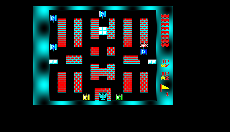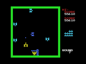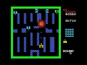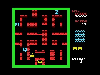You assume a non-descriptive yellow tank, pitted against a battalion of blue tanks that attack en masse. Each round requires defeating the twenty of them, but they always spawn in spread formation from above, and the screen quickly becomes busy with all the enemies treading through maze-shaped level, making it hard to track them down. The walls can be torn down with your unlimited supply of gun, so with a bit of effort you can reform them to your advantage and get into position where you can cover all sidetracks. Another useful tactic is that, much like Space Invaders, you can parry projectiles by firing your own at them, giving the player a safe ground provided you don’t play too recklessly.