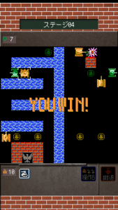 The main game is a 60-level campaign, starting with a set of regular tanks that have no specialty, but you gather more as making progress, collecting the ones with higher velocity or longer-ranged arsenal, and even soldiers who can board the tanks, lending their own help if they get destroyed. Any defeated vehicle in battle is permanently lost, but rewards from clearing a stage is generous enough to compensate for it, and eventually the game allows you to manufacture them for yourself if you beat the optional factory levels. There’s also an obligatory level editor that lets you share your work via creating a QR code.