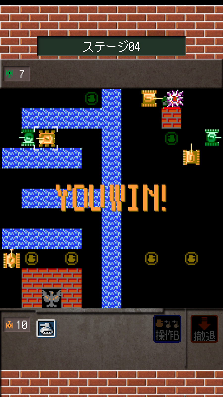 The overall mechanics will be familiar, but the biggest difference is that you send out multiple tanks just like the enemies, complete with visible unit spawners on field. As expected, it ditches the traditional D-pad controls in favor of touchscreen interface. Select a unit and touch wherever you want it to go, and the pathfinding AI will do the rest of job. Once stopped, you can change its direction by sliding your finger on it. Since there’s no manual fire button, all tanks spontaneously chuck their bullets periodically. There are two options for ordering your unit that can be changed on the fly: the “Control A” forces it to complete its move until it can accept another command, whereas the “Control B” allows to change its course in the midway. You might think the Control B renders the other one pointless, but this was probably added in case the player’s device is too faulty to perform too many actions at once.