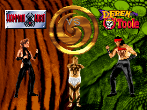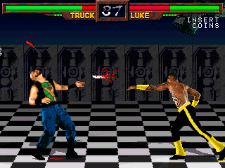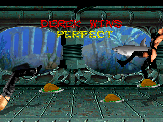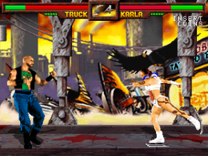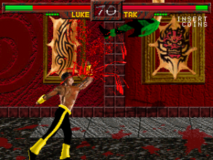 In terms of graphics, the characters tend to have less frames than your typical Mortal Kombat character, leaving their animations choppy. The backgrounds are simplistic and don’t have any animation to them, with the only real highlight being the outside of a tattoo parlor that has a giant bald eagle draped over the front. The graphical highlight would have to be the fact that the health bars explode messily into blood when somebody runs out of health, and even then, Primal Rage did that far better. The music, a waste of the talented Brian Schmidt, is so muted it might as well not even be there, and characters are often missing sound effects or make grunts from the wrong gender entirely. At least they managed to get Koldan to shout out “NOT!” properly every time he appears on the fighter lineup.