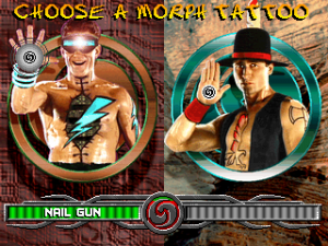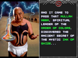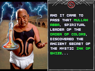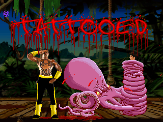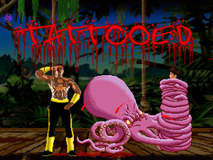 The plot, such as it is, was actually written in cooperation with Bob Gale, screenwriter for the Back to the Futureseries. A mystical order discovers that the mystical Ink of Ghize, if you paint tattoos on certain people with it, can temporarily turn into real objects. The generically evil Koldan steals the secret of the ink, intending to use its power to enslave mankind. Only nine people are also compatible with the ink, eight of which are possessed by Koldan’s power. There’s your excuse to go murder all the other fighters, defeat Koldan’s mutants, and probably kill Koldan himself, because the game isn’t particularly hard. All of this, by the way, is ignoring the short person in his underwear who appears throughout the game, as well as the fact that you select your character off of a woman’s bare back.