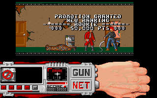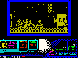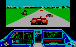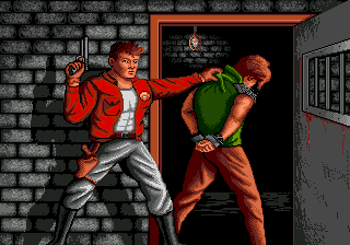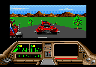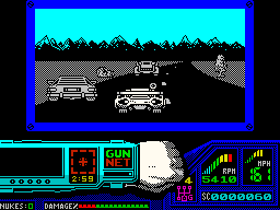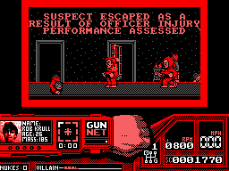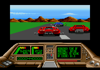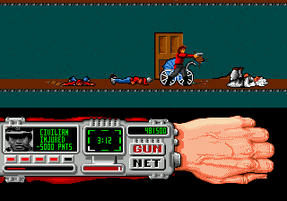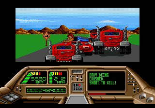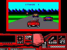 The other ports are largely inferior. The Apple II version is the only game ever produced by a mysterious unit called James & Paul Software. It loses all of the gore animations while maintaining the original’s look and feel. The DOS version awkwardly scrolls screen by screen, but otherwise plays and looks as good as the other 16-bit versions. The Spectrum and Amstrad versions are totally different, with cartoony characters that turn into clouds of smoke and an overall much slower pace, both in the driving and shooting sequences. The Commodore 64 version is probably the worst looking and playing version, with all sections playing slower and a tendency for the racing portions to suffer from graphical glitches.