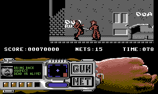 Melee-weapon toting DOA scum are everywhere and can be dispatched with two weapons: the Tonari Snare Gun and the .95 AutoMag. The former functions as a net and is required if the area’s boss needs to be captured alive. The AutoMag on the other hand explodes enemies into a twitching puddle of gore. Had the game been more popular, this probably would have sparked the same controversy as Mortal Kombat a couple years later. Instead, North American magazines largely ignored the title. The only real reactions that can be found pertain to the Amiga original from European print sources, which either praised or shunned the blood and guts. Commodore User gave the game a 77%, noting the detailed and gory graphics and little else. Meanwhile, Amiga Resource, The Games Machine, and Amiga User International gave the game low ratings, all expressing concerns regarding the violence. Many print sources also compared the violence to Death Wish 3, a similarly brutal C64 game also by Gremlin Graphics, in which a pixelated Charles Bronson blows up goons with a rocket launcher.