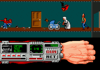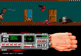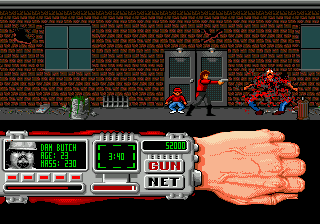 Once you reach the hideout, the real struggle begins. Rushing from the car and into the the building, the player is thrust into an elaborate maze. Navigating this requires the Techno Cop to use his wrist-mounted computer, which functions as a locator. It continuously points an arrow in the direction of the stage’s boss. Even with the extra help, navigation is rough: while the arrow does give a general sense of direction, the levels are very large and filled with countless dead ends.