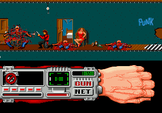 While blowing up punks isn’t the wildest idea in the realm of video games, much more unusual is how you can kill a variety of civilians who don’t directly harm the Techno Cop. Different people, including little boys, grannies, and runaway baby carriages fill the halls of the DOA tenements. While mostly harmless, running into an innocent causes Techno Cop to stub his toe, forcing him to uncontrollably start bouncing up and down on one foot and leaving the player open to a quick bludgeoning from the DOA. The easiest way to remedy this is to shoot the civilians, at the cost of only a few thousand points. There are few prior action games where players can gleefully mow through innocents with reckless abandon; in most rail shooters, the player will lose some health, while all the Grand Theft Auto games and their many clones send the police after you in a flash. Here, the terrorism has little impact on gameplay, making Techno Cop a gleefully cynical game.
