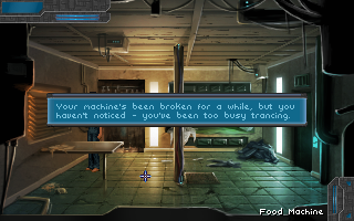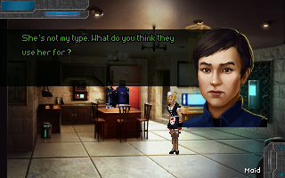 One major difference is how the game divides itself into segments. Unlike other Wadjet titles, which give you a map of areas to explore, every chapter of Technobabylon is its own beast. You’re given a set few screens to explore and interact with, where a surprisingly complex series of puzzles are set-up. The tired old strategy of using everything on everything doesn’t really work that well here, as the item selection in most every area is very limited. Instead, most puzzles revolve around picking the most logical course of action in a given situation, a more new age style of design. The trick given here is that several of these puzzles require understanding how to best use unfamiliar technology and experimenting with their uses. Chapter three introduces a really fun puzzle involving switching around an android’s brain to get information, switching out its base function, personality, and memories to eventually find the right combination that gets it to spill the beans. It’s still a logical solution, but it forces you to think with new rules in mind in a believable way.
