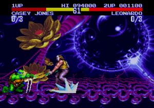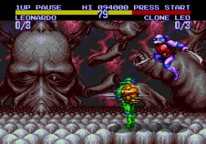 Splinter is again kidnapped by the Foot, though this time not by the Foot Soldiers, but rather evil clones of themselves taking Splinter back to Dimension X with them. Realizing they are now up against a much greater force than ever before, they enlist their friends to go with them to the evil Dimension and fight the clones and rescue their Master and father. The available roster in this game consists of Leo, Raph, Mike, Don, Casey Jones, April O’Neil, Ray Fillet and the Genesis exclusive original character; Sisyphus. The unplayable bosses are Triceraton, Krang and Karai. Shredder, now presumably defeated after the events of the previous game, is not featured in the game, so newcomer Sisyphus will have to do. Though the boss characters are rendered unplayable, there exists codes to make them playable through the use of cheat devices.