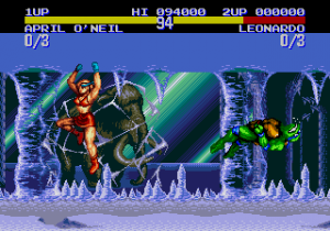 The sprite characters are definitely gorgeous at first glance and the general design of each character is well done, but lack a good amount of animation frames, leading to some moves even being one single frame rather than a smooth flowing animation. April seems to be the character suffering most from this problem, and her sprite shows signs of being hastily modified from a certain female character in the SNES version in some of the moves, suggesting that the SNES game was the lead production out of the three games.