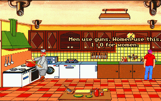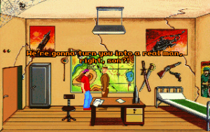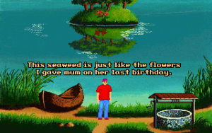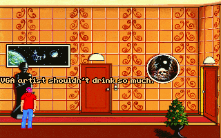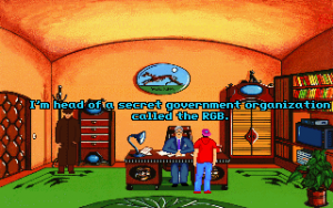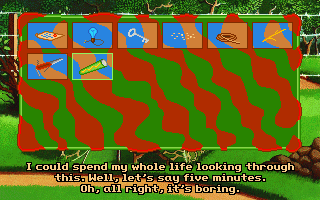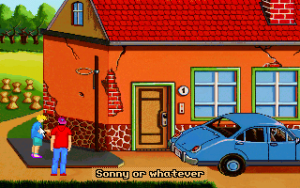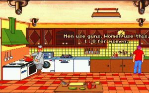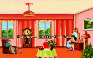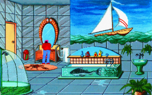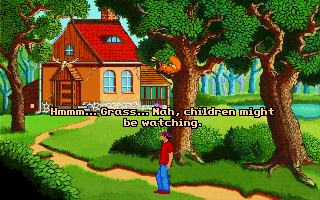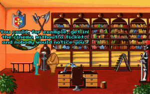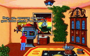 Although it’s fairly short, Teenagent is competently done in almost all respects. The interface is almost a little too clean; the left mouse button is used for all movement and examination, while the right mouse button is the universal action button, meaning there’s at least no concerns about using the wrong verbs. Unfortunately, the puzzles are just little bit more lacking in logic than the typical adventure game fare. Most of the solutions at least sort of make sense in hindsight, but there are a couple of necessary actions that really don’t seem to be discoverable outside of frustrated guessing, and there’s more than a few pixel hunts that are entirely unnecessary. (Is there any kind of purpose at all to forcing a player to pick out unaided the single useful rectangular block in a giant bookshelf?) The bright, slightly cartoonish graphics are clean, timeless VGA sprites, and everything looks like it should, with almost every action yielding a surprisingly detailed animation – pretty much every picked-up object goes down Mark’s pants one way or another, for instance. The background music consists of jaunty little MIDI tunes that fit the lightly-humorous mood nicely.