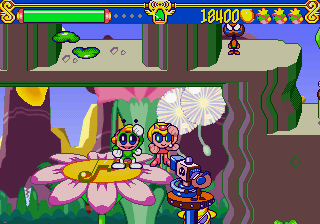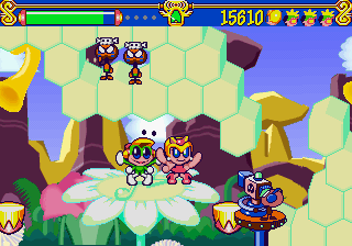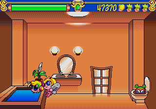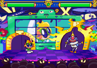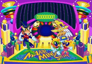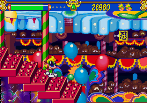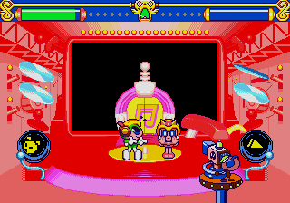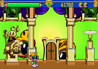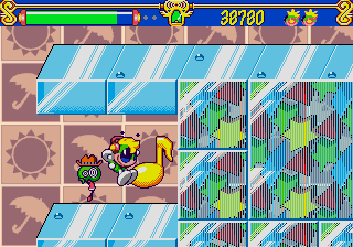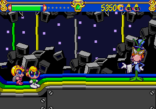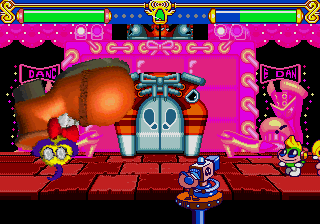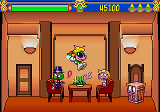 That much is clear by looking at one of the game’s more distinctive features: its art style. At first glance, it looks like many of the game’s artistic choices were made to flex the 32X’s muscle. That’s why Tempo emphasizes its fluid animations, vibrant colors, and pre-rendered 3D bosses: because the technology made them possible. Look a little bit closer, though, and you’ll find the game has a more well realized art style than it initially lets on. Some levels make you feel like you’ve wandered into a music video; they bombard you with flashy pop art and rapidly changing colors, and you pass by enough conveyor belts and monitors to think you’ve stumbled upon a factory-turned-dance-club. (The stylish soundtrack only deepens the feeling.) Other levels are just cartoony, their soft pastels and curvy geometric backdrops resembling cartoons from the 1970s. In any case, the two work well together to create the exuberant dance vibe that Tempo thrives on. Even the bosses’ claymation appearance contributes to the game’s nostalgic overtones.