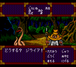The first Tengai Makyō game, Ziria, initially came out in 1989 as one of the first titles for NEC's PC Engine CD-ROM. However, by the look of it, Ziria barely seems any better than an 8-bit title. The developers clearly wanted to duplicate the appeal of Dragon Quest, with blocky tiled graphics and characters that are always walking in place for some reason. One should be thankful they actually put in a dash button so your character doesn't saunter everywhere. The first-person view battle system is also a rip-off, although at least the graphics here are just slightly better. But like any old RPG, they move far too slowly, especially considering you'll be fighting quite often to gain levels. The rest of the game barely takes advantage of the CD-ROM storage space, as almost all of the music is PSG, even if it's all composed by noted Japanese musician Ryuichi Sakamoto. There are voiced cutscenes, although the artwork is really pretty bad. The characters are all based off the Japanese folktale Jiraiya Goketsu Monogatari. They also inspired several characters from the anime/manga Naruto.