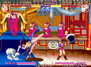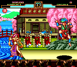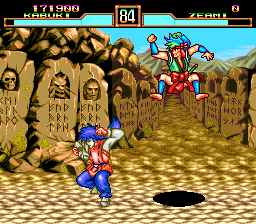 It would be easy to describe Kabuki Klash as "Samurai Shodown with Tengai Makyō characters" and just be done with it, but that would be lazy. But the comparisons are obvious, right down to the same awkward control scheme (pressing two buttons at the same time to execute a strong attack) and items being tossed into the foreground that restore health, boost power and whatnot. The characters are all grabbed from Ziria and Manjimaru, so if you ever wanted to pit Kabuki against Tsunade to see who is more obnoxious, now is your chance. The roster is a little weak with only eight playable characters, alas. Overall, the game is a little simpler than Samurai Shodown, but it's fairly well executed and kind of fun. Notable for being the first (and only) appearance of Tengai Makyō outside of Japan.