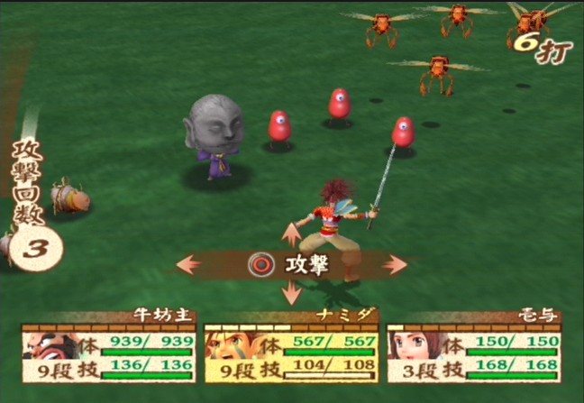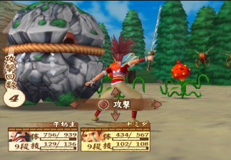 The structure is much like Manjimaru - there are huge overworld maps to explore at your leisure, and once again, you obtain magic spells by visiting Tengu hideaways. Some of it does come across as a bit dated, especially given the extreme amount of backtracking you'll need to do, but people bemoaning the linear, cinematic nature of modern RPGs will be pleased. Thankfully, the battle system has been given a huge overhaul, ditching the old-fashioned first-person combat. While most RPGs have you fighting three, maybe four bad guys at a time, Namida routinely tosses between ten and thirty foes to battle against. Each attack by your character can knock out as many as a dozen enemies at once, so combat moves quickly, and it's pretty cool to see your characters plow through rows of enemies like a bowling ball, sending your worthless enemies flying aside. Each character has a certain number of attacks per round, and can vary between regular attacks or special abilities. There's also a power meter that builds up as you inflict or take damage, allowing you to do an special attack that can be turned into combos with your fellow party members. Your abilities gain experience the more you use them, giving incentive to make great use of the various abilities.