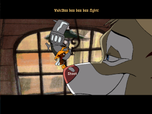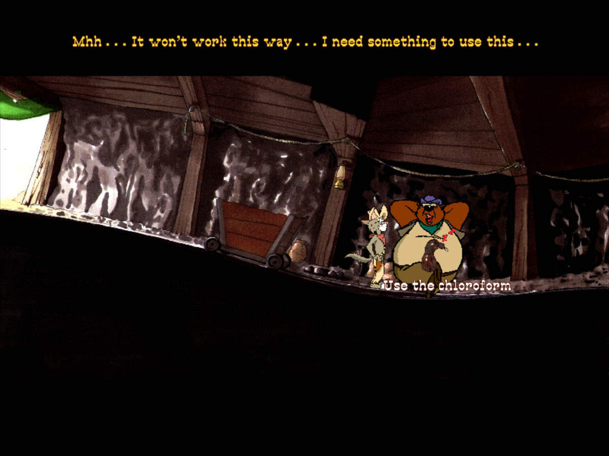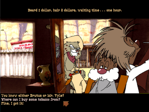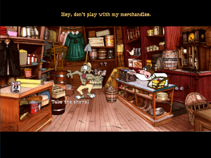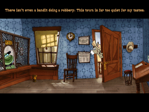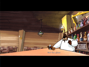 Tequila & Boom Boom is a simple take on the point-and-click adventure style, where you use a cursor to move, talk to people, examine or interact with objects, and use items from your inventory to move the plot along. The left mouse click automatically performs the one action you’re able to do on any given object, while right clicking lets you examine your inventory (accessed with Tab) and very rarely examine characters. This allows for relatively smooth play, which is further assisted by double clicking the exit hotspot to instantly move between screens.