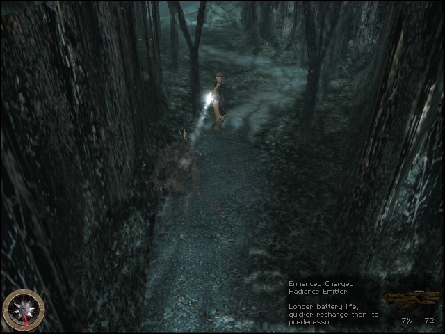 Elspeth carries with her most of the gear she supplied Stranger with in Nocturne and some more. The SPS (Spectral Proximity Sensor) is supposed to capture spirit activity in the vicinity, giving out an eerie scratching sound, not unlike the radio in Silent Hill, but also visual feedback on an oscilloscope. The night vision goggles have been improved for more battery lifetime, so their use is now limited only by daylight. The Doc has also developed a new generation Sun of God, including a more portable handgun. In light of all that high tech stuff, the ordinary compass comes off like a relic in Elspeth's inventory, but it does come in handy in the woods.