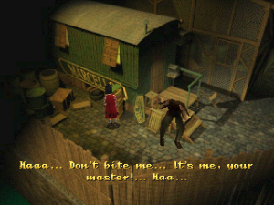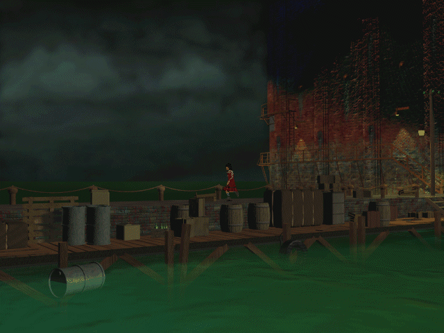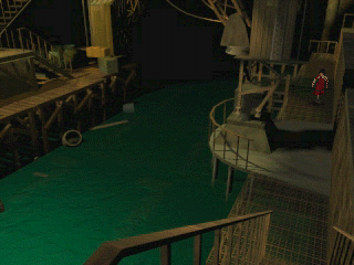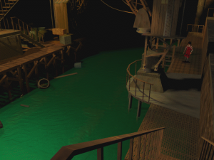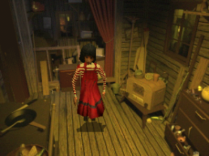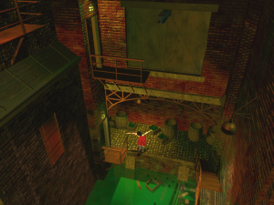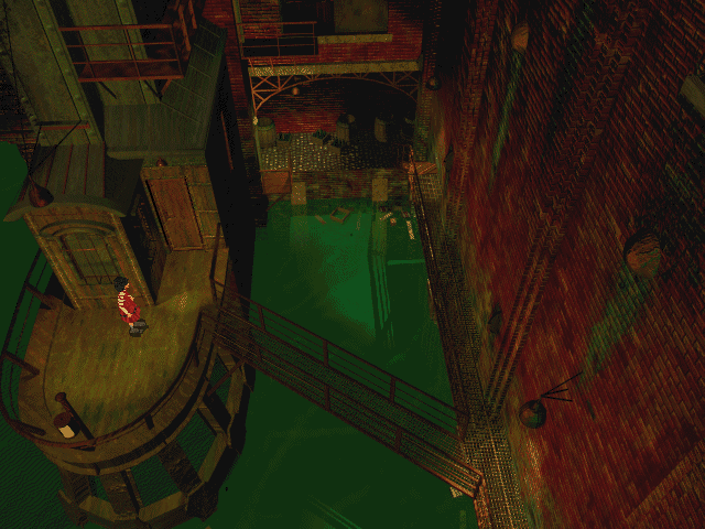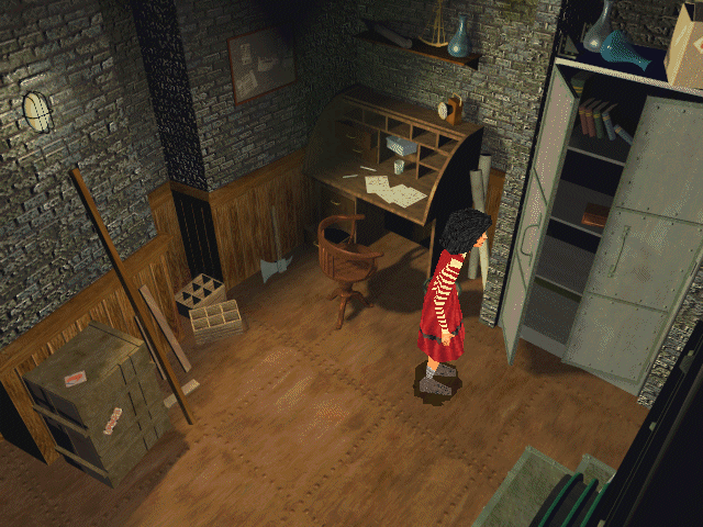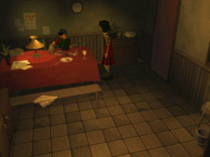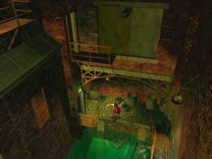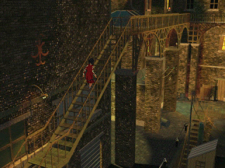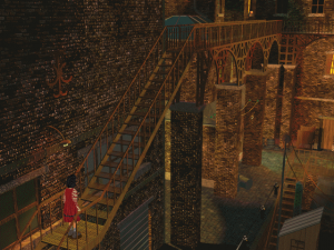 Another frustrating element is how Miette moves. The controls are much like a Resident Evil-style survivor horror game, with polygonal characters over rendered backgrounds, which change to totally different camera angles as you move from screen to screen. The game world is very small, and she can run, but each time she bumps into an obstacle, even when simply walking, she will enter a three-second animation of her acting as if she has just slammed against something, during which you can only wait for the controls to be given back to you. The same goes for stairs, where she has to spend some time aligning herself perfectly with them so as to be able to enter the right animation. Still, the graphics are pretty, especially in the Windows version, benefiting from a higher resolution and generally less pixelated models. The PlayStation’s low resolution graphics actually bring another issue: the metal bar mentioned above is simply invisible in that version, although it is supposed to be in plain sight, for once. And you cannot really discover it by accident because it is placed on top of boxes you have to climb onto, which you would never do if it wasn’t for this bar. The scenery, as in the film, is actually pleasant to look at, if a bit repetitive. The accompanying music is also one thing that saves this game from being a complete wreck.