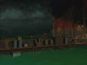 The puzzles that are not bland and uninspired (give food to the hungry man, a drink to the thirsty one…) are practically impossible to figure out. Early in the game you have to throw a metal bar at the lighthouse’s electric box in order to turn it off so the guard will come and fix it. This is the same guard that is preventing you from entering the hut you’re supposed to rob, but that is never made clear beforehand in any way. Some items have absolutely no purpose, but some of the necessary ones are actually invisible, because hidden behind a pillar or a box or in complete shadows. The only items you can easily spot are generally the useless ones. What’s more, even the items that you can pick up are indistinguishable from the scenery, so you may not realize that you can get them unless you are right in front of them and an indicator pops up.