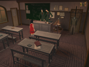 The setting is that of a nameless, steam punk-looking city by the seaside. An evil scientist has his henchmen, the cyclops, kidnap children in order to steal their dreams to prevent the process of his premature aging. The cutscene at the beginning of the game shows one of these children getting kidnapped, and that’s really all the information you’re going to get from the game itself. Next thing you know, you are in control of Miette (meaning “crumb” in French), a 12 year old girl in a red dress. You find yourself in a classroom and in front of Siamese sisters telling you to go steal money from a hut, without really explaining why or how.