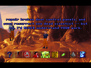 This version would have been very violent, as Toshi was meant to die horribly in an acid-shower in a cavern. (An “aciddent”, if you will.) Not only that, but it was filled with lots of scientific lingo, the sort of technobabble that sci-fi fans would likely enjoy the hell out of, but would scare the mass audience that the LucasArts’ executives were hoping to attract. A lot of the art styling came from this version in terms of color and general theme for the environments. It used a new engine called Storydroid, which supported additional visual effects, had a more traditional multi-icon interface. Unfortunately Moriarty left as the project became too stressful and he was unhappy with the direction that management was taking the project.