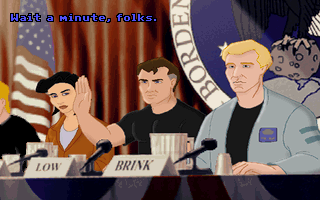 Although the initial design documents have surfaced on the web, very little of the game seems to have actually gone into development. And so, after eighteen months, Brian Moriarty, the designer of Beyond Zork (Infocom) and Loom (LucasArts) took over after Falstein left the project. He scrapped everything that had been done, and his version became the zygote of the final experience. The three main characters were changed to Low, Robbins and Brink, as they were in the final game. In this version was a fourth main character, Toshi Olema, a Japanese businessman who was funding the project on the condition that he could join the team.