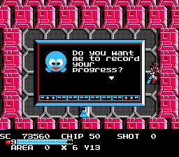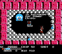 The game’s Japanese title is Guardic Gaiden, presenting it as a sequel/spin-off to the MSX game Guardic. However, according to the developers, the name was established before the game even began production, and the actual design, and even story, has nothing to do with Guardic. The only connection is the use of Guardic’s theme music as the password tune. There was also some discussion about changing Miria to a man for the English release, as they weren’t sure how those audiences would respond to a female protagonist. Of course, they decided against it. It is a little unusual that Nintendo of America would allow a main character that trots around in a red bikini, but the sprite is so small you can barely make out that detail.