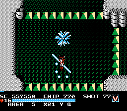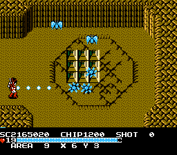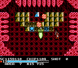 The surface of the abandoned planet, called the labyrinth section, is much like Zelda, as you explore its mazes to find power-ups. Rather than trudging through dungeons, you fly through corridors, which are tunnels that go straight through Naju’s mantle into the core of the planet. Whenever you reach a corridor, the Guardian changes back into a ship for a shoot-em-up stage. After defeating the boss, you’ll get some kind of goodie, either a power-up or a key to access the next area. The entrances to the main corridors have some kind of trick to opening them, which are revealed by exploring the areas to find hints.