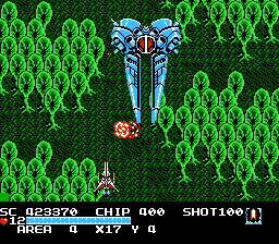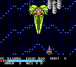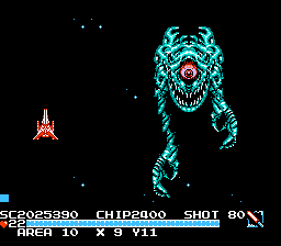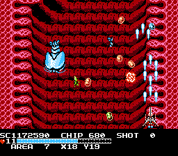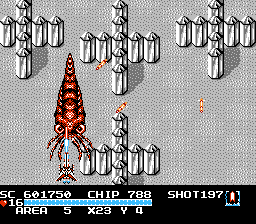 The game does suffer from some repetition – there’s only so much you can squeeze into a 128kb ROM cartridge, so many areas and enemies are simply palette swaps. There are over twenty corridors, though many are similar, just harder and faster. Still, these shooter stages throw enough new bosses at you that it keeps fairly fresh throughout. The difficulty is also a little unbalanced – some enemies can kill you in a few hits while others merely chisel away at your life, and some earlier bosses are more difficult than later ones. Plus, unlike other Compile shooters, getting hit just drains your life rather than outright killing you. This makes the game more forgiving, but your ship is also rather large, and there are some spots where avoiding damage is basically impossible, forcing you to weather it and then grab a health restorative.