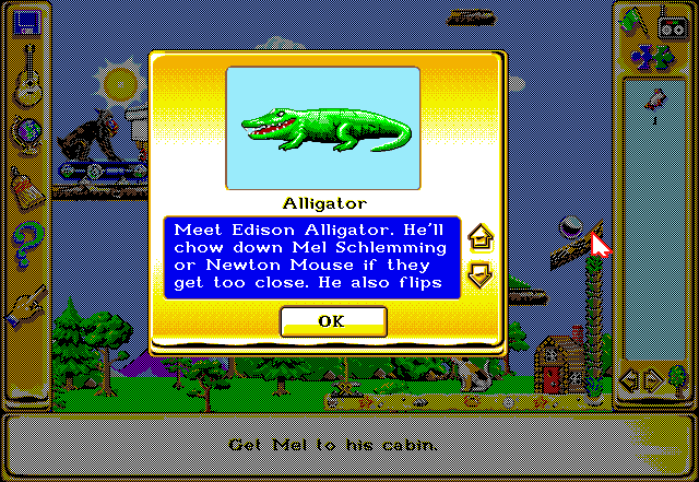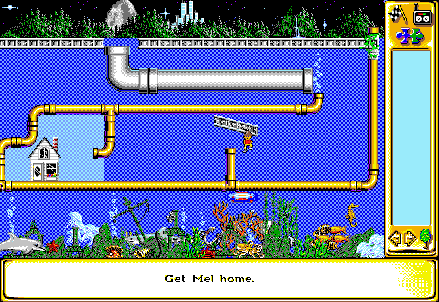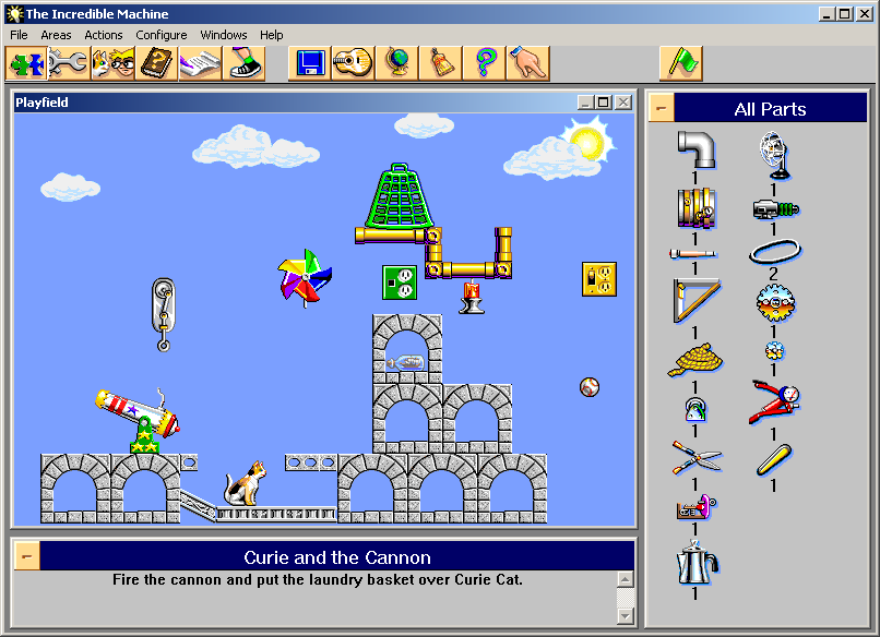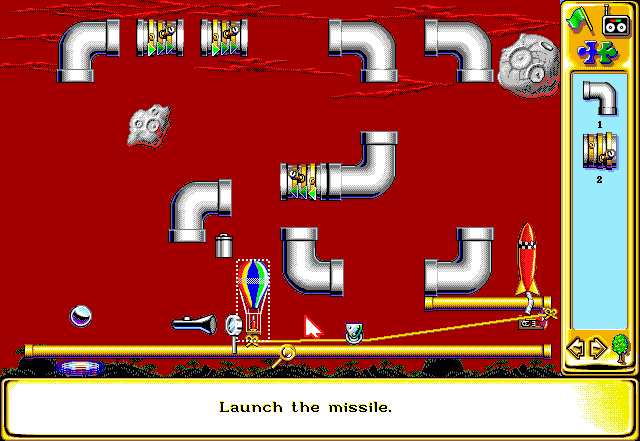 Just about every part from The Even More Incredible Machine makes a reappearance, along with a wide supply of new tools to work with. Unlike the weird toon logic of the previous game, the new parts here make a little more sense – in that weird, Rube Goldberg way, at least. Laser emitters need power but will fire off a beam that’ll light fires, reflect off of mirrors, and activate certain switches. Fire itself can be created through candles, bumping flint rocks together, and can be used to get tea pots boiling, light fuses, or send hot air balloons soaring. Pipes are useful for getting anything that’ll fit through them quickly from one place to another, with curved pieces helping them reach further off into new directions. There’s a lot to play with, and it’s generally fairly intiuitive.