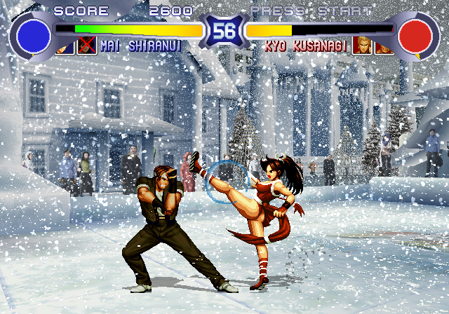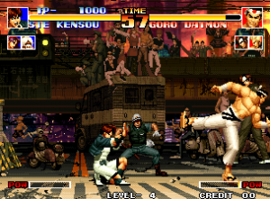 For its tenth anniversary, SNK remade their first KoF game under the name King of Fighters ’94 Re-Bout. This rerelease generated some excitement for the franchise due to the character sprites being touched up and optimized for high resolution. In execution, though, they appear simply upscaled and smoothed out with techniques used by many emulators. The actual animation remains the same as before. It’s not as good as the actual high resolution sprites seen in its contemporaries like the Guilty Gear series or Hokuto no Ken, but they at least look smoother than any game from the Neo Geo series itself. SNK also added a whole slew of nice new 3D backgrounds, many of which include cameos by characters from later games. There’s also a cool three minute long intro showing the various characters brawling, and while it’s not as good as the King of Fighters: Dream Match 1999 intro on Dreamcast, it’s a nice extra.